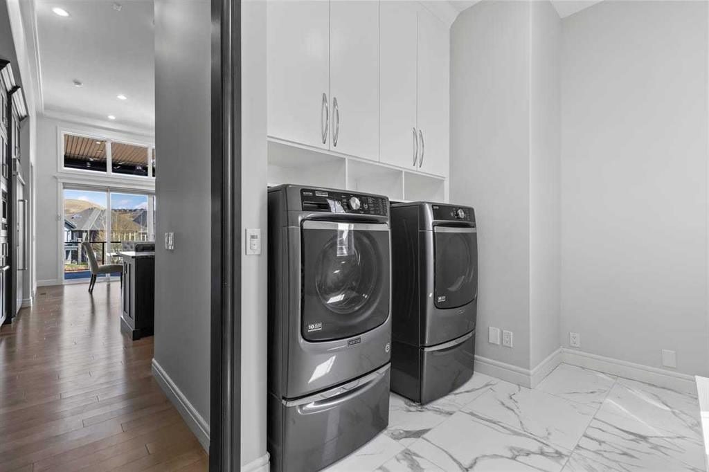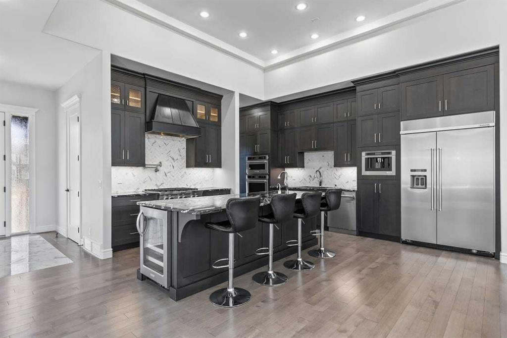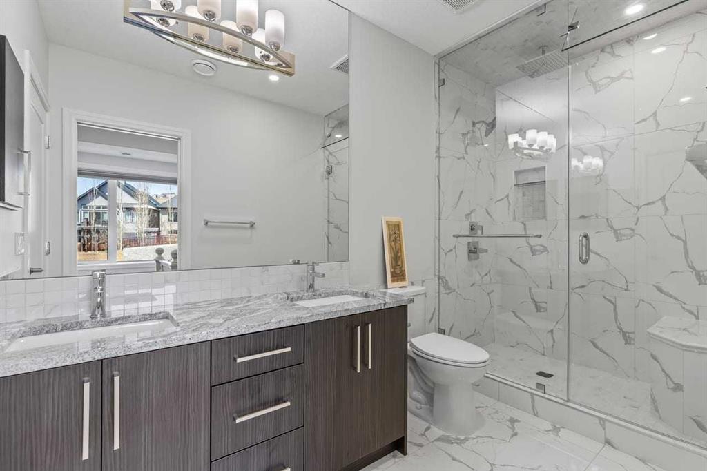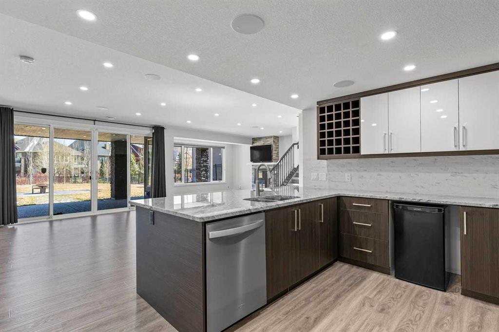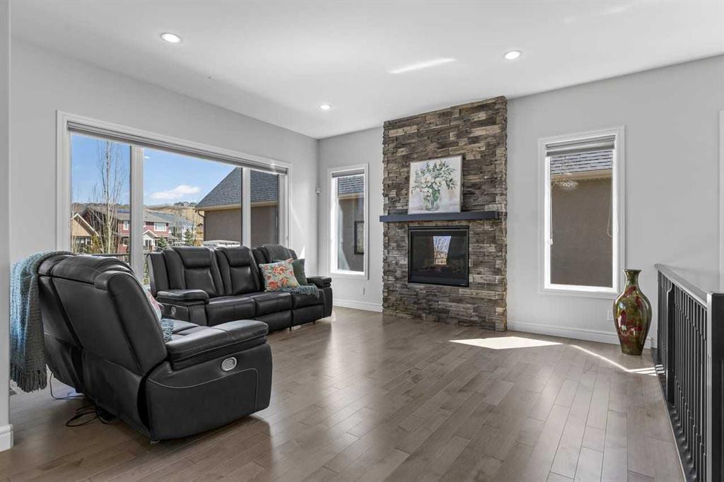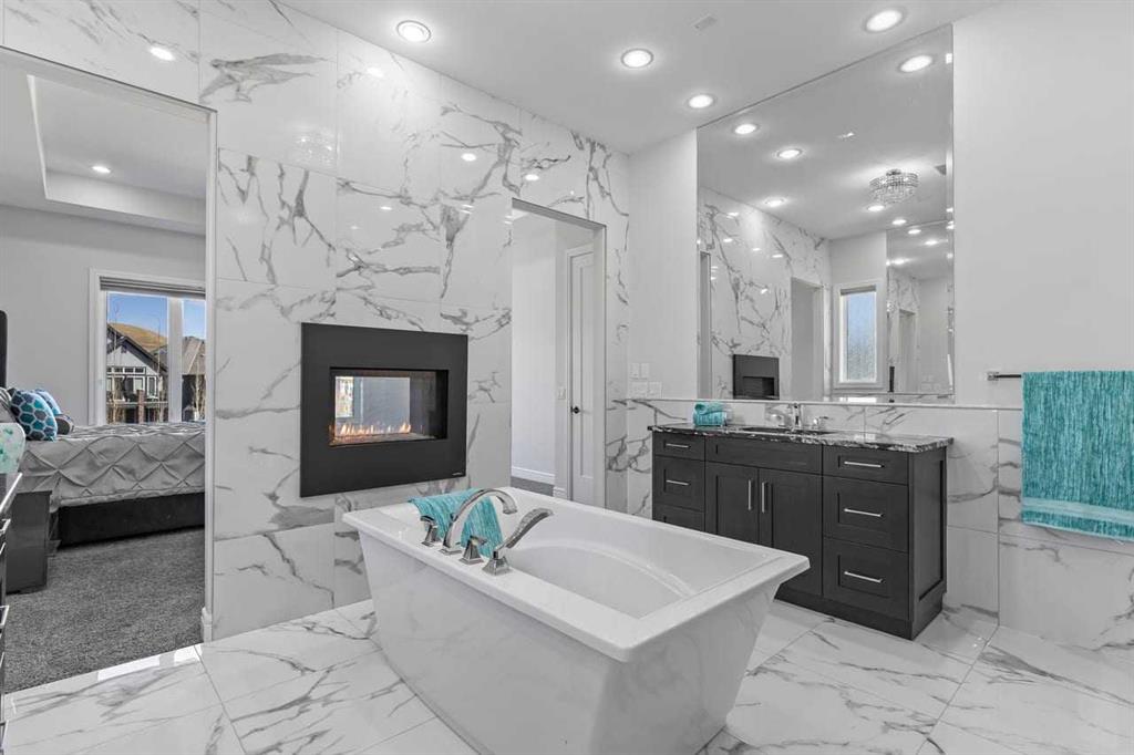 Luxurious Dream Bungalow is situated on a massive 62 x 202 almost 1/3 Acre of lot in the prestigious Riverstone Estates of Cranston, built by ALBI Homes. Offering over 3,900 sqf of beautifully developed living space, this home is in an exclusive community just steps from the BOW RIVER & FISH CREEK PARK. This stunning property features soaring ceilings, over $200,000 in upgrades, and a heated 4-car garage with a HI-LIFT setup ready for 2 more vehicles, finished with a striking flaked FX EPOXY INFLOOR HEAT...