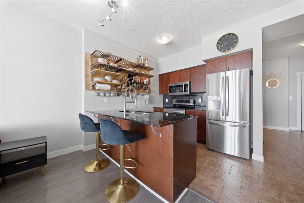 Stunning executive condo in London at Heritage Station! This spacious 13th floor, 1 bedroom + large den unit offers 818 sq ft, making it one of the larger one bedroom floorplans in the building and ideal for a live/work setup. Enjoy beautiful city from every window, along with an open concept layout featuring 9’ ceilings, laminate flooring, modern finishes, and granite countertops throughout. The kitchen offers espresso maple cabinetry, stainless steel appliances, granite countertops, a large island with br...