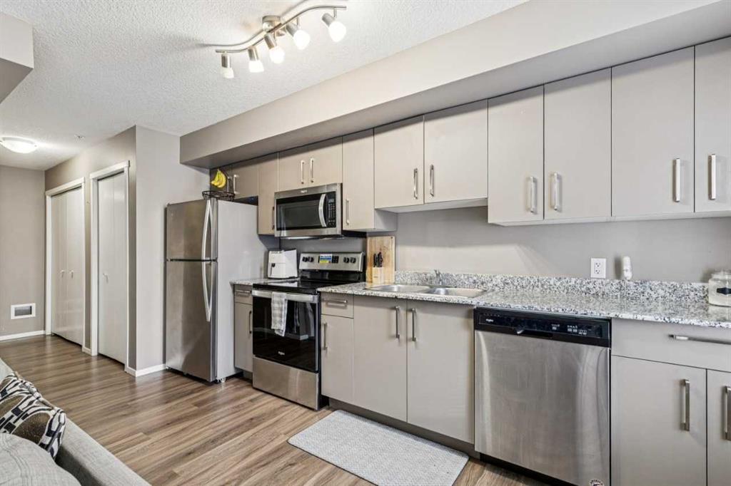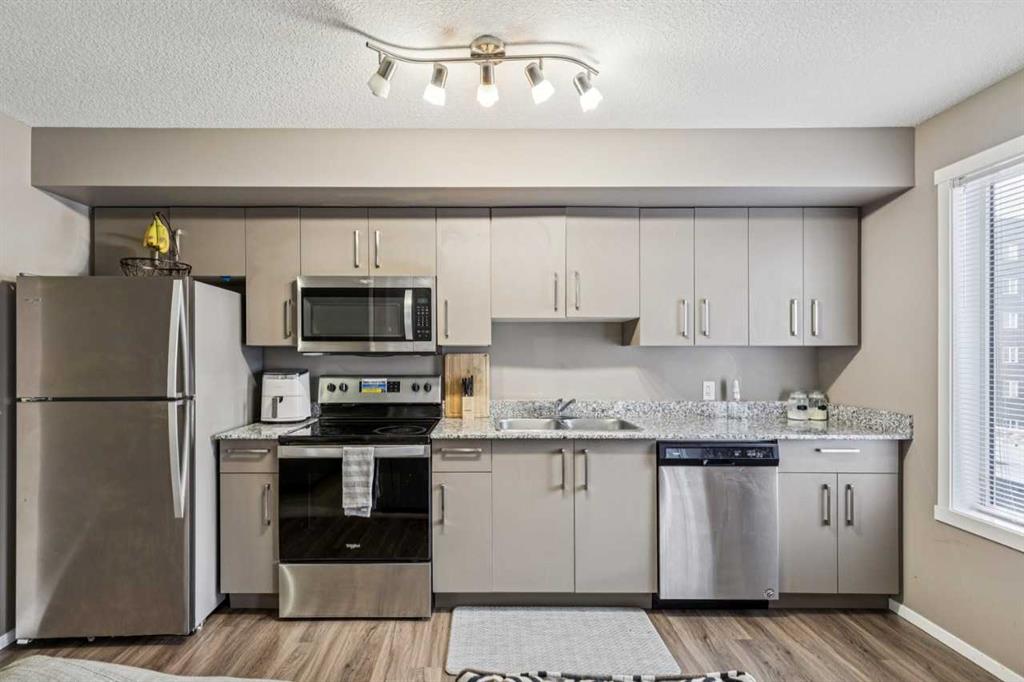 Welcome to this well-maintained apartment in the desirable community of Skyview Ranch. This bright and functional unit features titled heated underground parking, light-toned cabinetry, granite countertops, and a versatile den ideal for a home office or flex space. Enjoy mountain views from the private balcony. The professionally managed complex is pet-friendly (with board approval) and offers excellent amenities including two on-site fitness centres, recreation rooms available for booking, and ample visito...