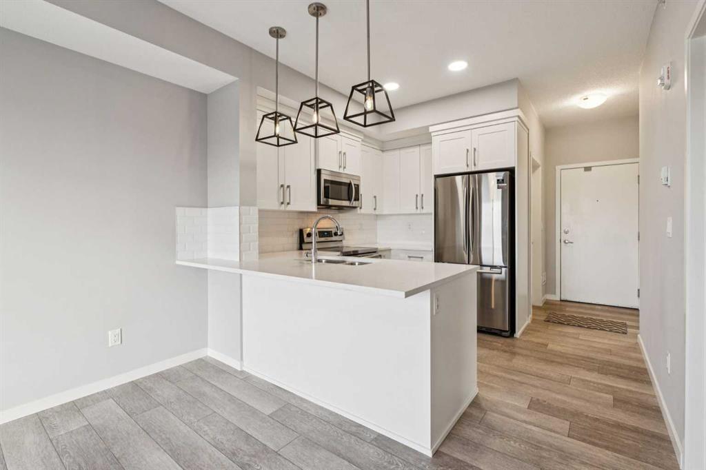 Welcome to The Rise—this bright, top-floor 2-bedroom, 1-bathroom condo offers move-in ready living. Freshly painted with new carpet, the open-concept layout is filled with natural light and complemented by vinyl plank flooring. The sleek kitchen is a standout, featuring quartz countertops, stainless steel appliances, full-height cabinetry, and a classic subway tile backsplash—perfect for everyday living and entertaining. The sunny living area opens to a west-facing balcony with a gas line for summer BBQs ov...