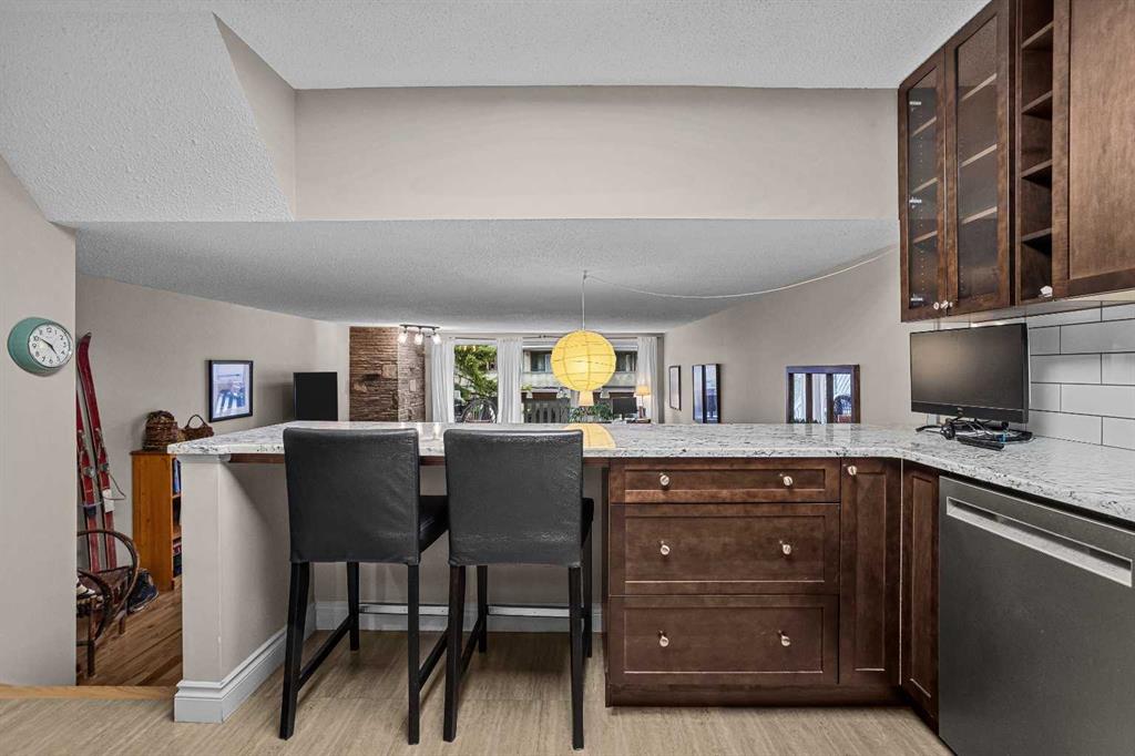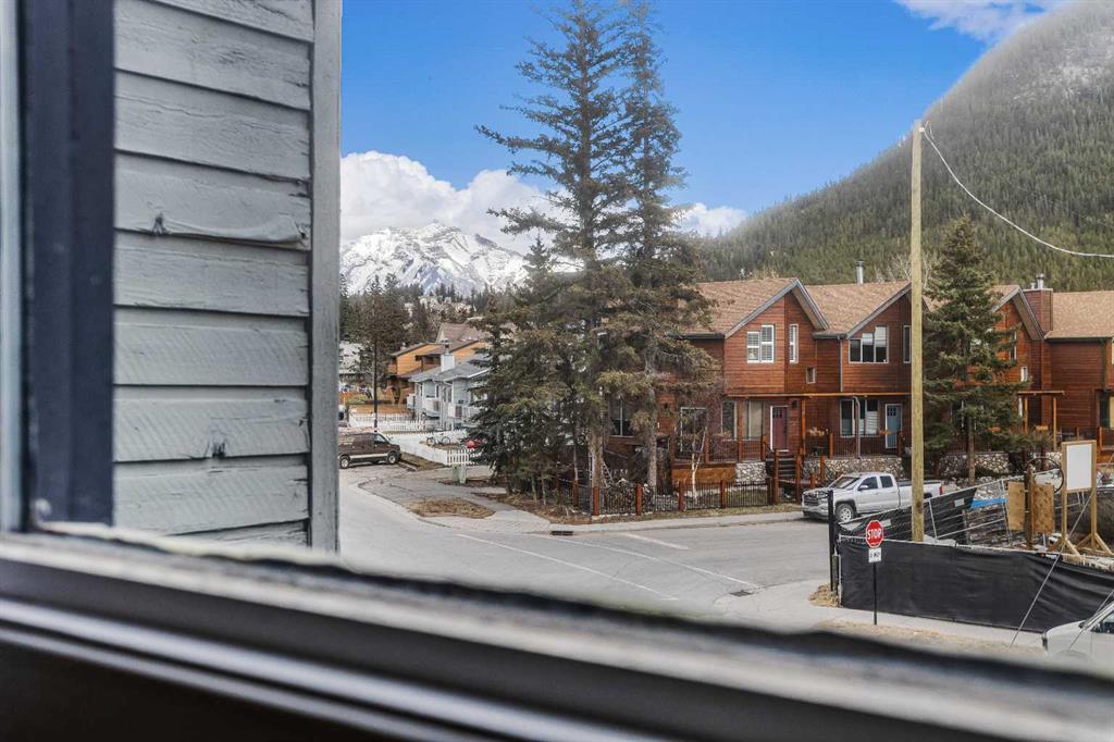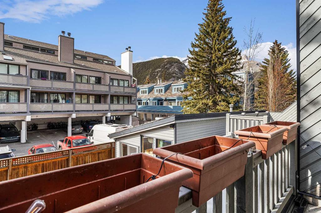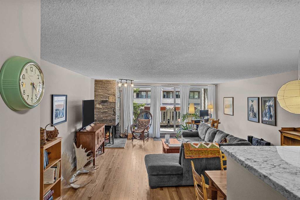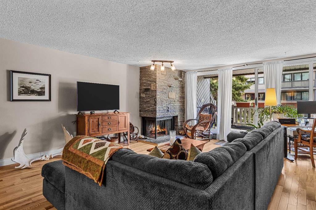 This centrally located 2-bedroom, open-concept condominium offers exceptional space all on one level-rare to find in Banff's market. Conveniently situated close to schools, shopping, and everyday amenities, this home is perfect for comfortable mountain living. Recent upgrades include beautiful maple hardwood flooring throughout, granite countertops in both the kitchen and bathroom, new kitchen cabinetry and modern appliances. Enjoy a cozy fireplace in the living area and step out onto the large covered deck...